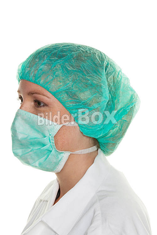 Beschreibung Chirurgin mit Mundschutz und Haube. Ärztin bereit zur Operation