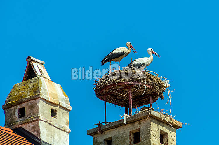 Beschreibung Ein Storchennest auf einem Achornstein in Rust. Burgenland, Österreich