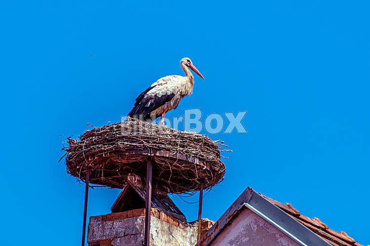 Beschreibung Ein Storchennest auf einem Achornstein in Rust. Burgenland, Österreich