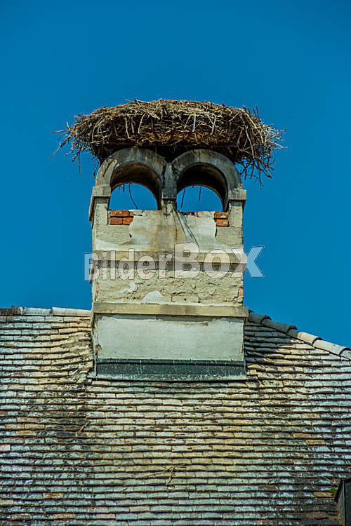 Beschreibung Ein Storchennest auf einem Achornstein in Rust. Burgenland, Österreich
