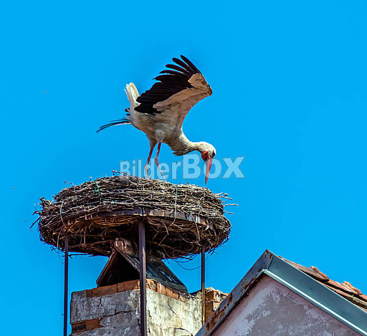 Beschreibung Ein Storchennest auf einem Achornstein in Rust. Burgenland, Österreich