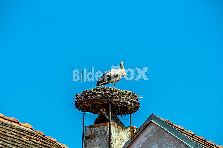 Beschreibung Ein Storchennest auf einem Achornstein in Rust. Burgenland, Österreich