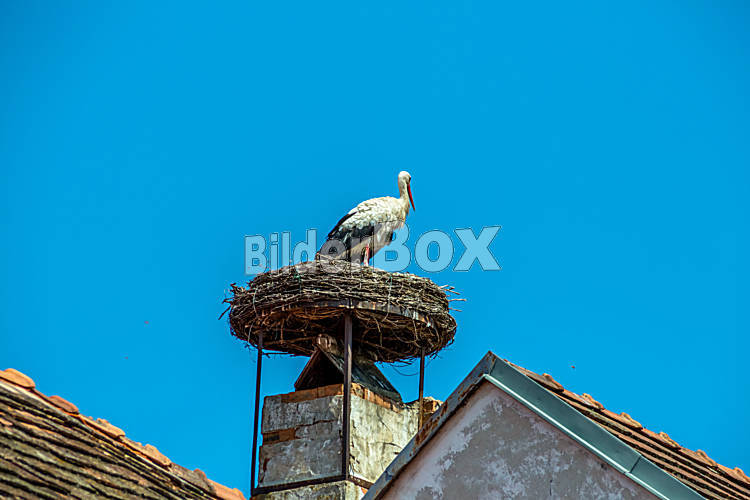Beschreibung Ein Storchennest auf einem Achornstein in Rust. Burgenland, Österreich