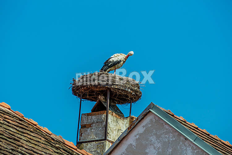 Beschreibung Ein Storchennest auf einem Achornstein in Rust. Burgenland, Österreich