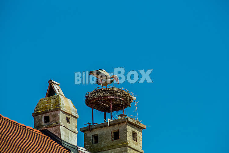 Beschreibung Ein Storchennest auf einem Achornstein in Rust. Burgenland, Österreich