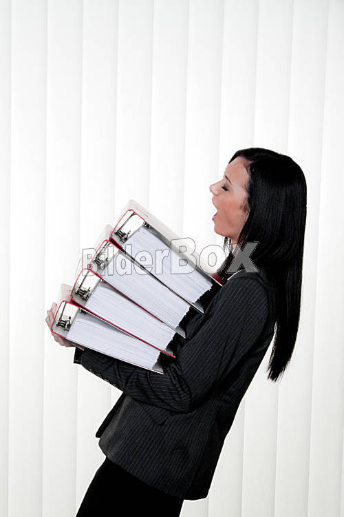 Beschreibung Überforderte Frau mit Stress und Ordner im Büro