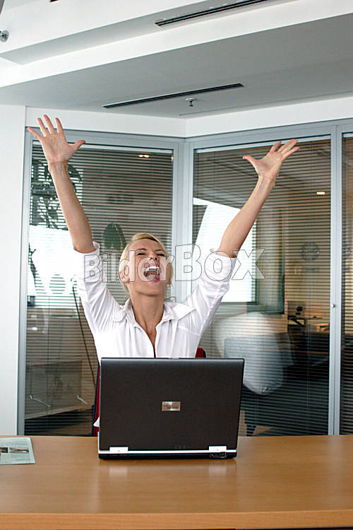 Beschreibung Frau mit Computer, jubelnd [ (c) www.BilderBox.com,Erwin Wodicka,Siedlerzeile 3,A4062 Thening,Tel.+43 676 5103 678. Verwendung nur gegen HONORAR, BELEG, URHEBERVERMERK und den AGBs auf...