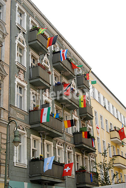 Beschreibung Hausfassade mit verschiedenen Fahnen [ (c) www.BilderBox.com, Erwin Wodicka, Siedlerzeile 3, A-4062 Thening, Tel. + 43 676 5103678.Verwendung nur gegen HONORAR, BELEG,URHEBERVERMERK und den AGBs...