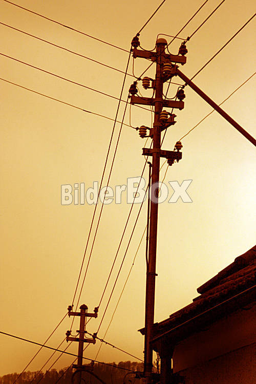 Beschreibung Strommasten auf einem Hausdach [ (c) www.BilderBox.com, Erwin Wodicka, Siedlerzeile 3, A-4062 Thening, Tel. + 43 676 5103678.Verwendung nur gegen HONORAR, BELEG, URHEBERVERMERK nach AGBs auf...