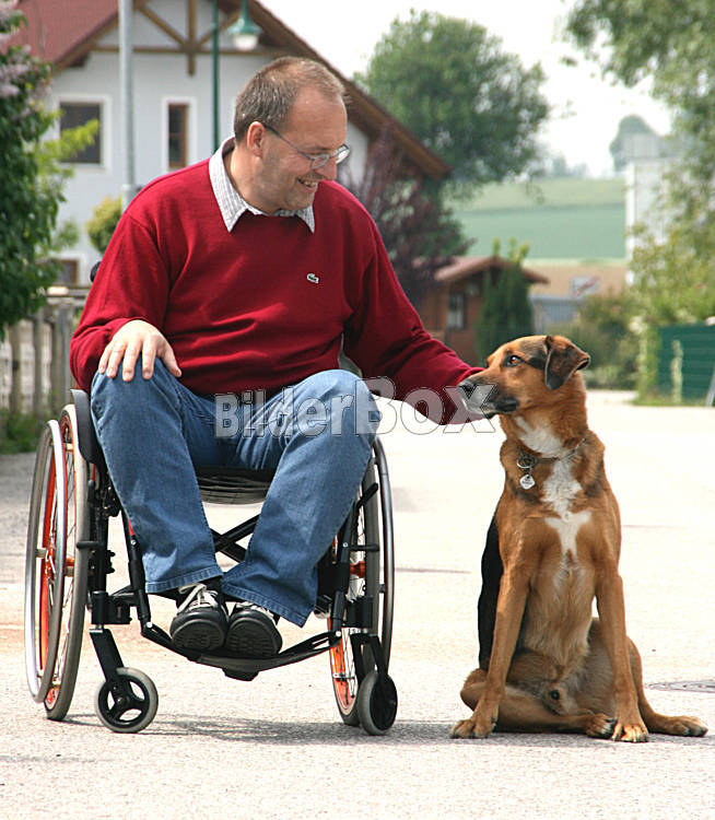 Beschreibung Mann im Rollstuhl mit Hund - man in a wheelchair with dog [ (c) www.BilderBox.com, Erwin Wodicka, Siedlerzeile 3, A-4062 Thening, Tel. + 43 676 5103678.Verwendung nur gegen HONORAR, BELEG,...