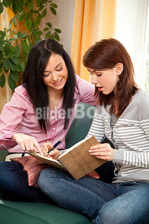 Beschreibung zwei junge Frauen schreiben ihre Gedanken in ein Tagebuch