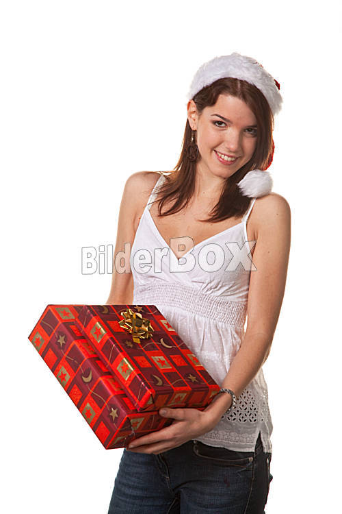 Beschreibung Junges Mädchen mit Weihnachtsmannmütze verschenkt ein hübsches Paket