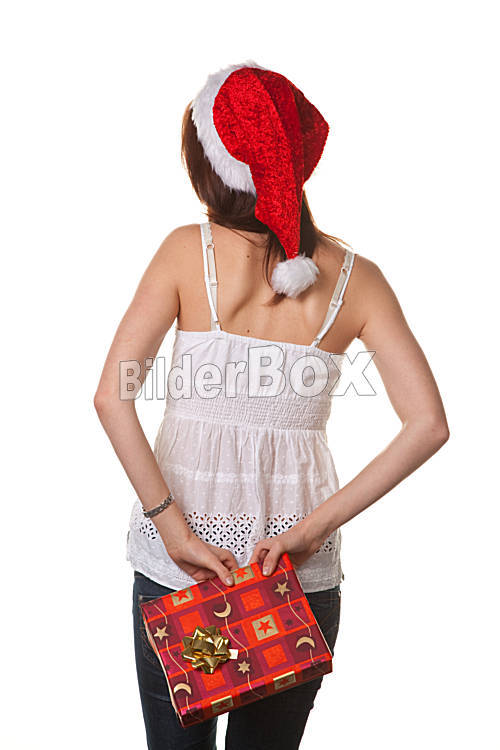 Beschreibung Junges Mädchen mit Weihnachtsmannmütze verschenkt ein hübsches Paket