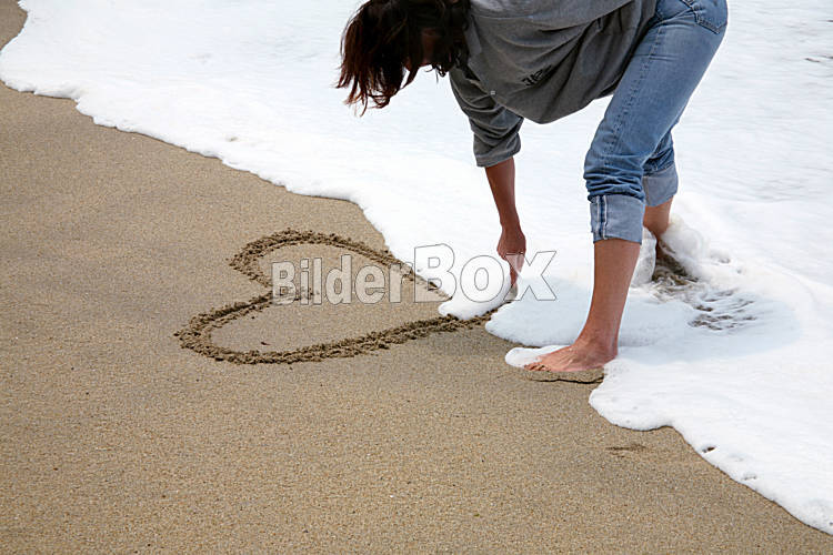 Beschreibung Frau zeichnet eine Herz in den Sand an einem Strand