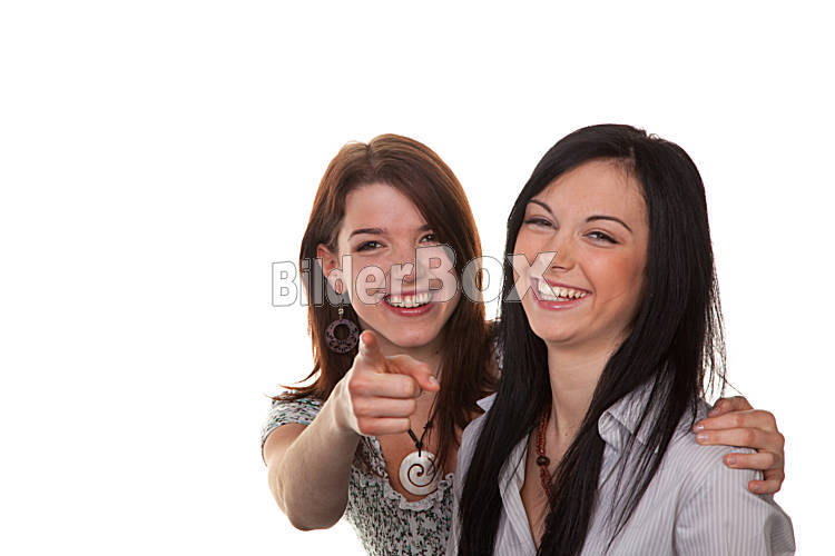Beschreibung Zwei junge Mädchen sehen etwas sehr komisches und lachen