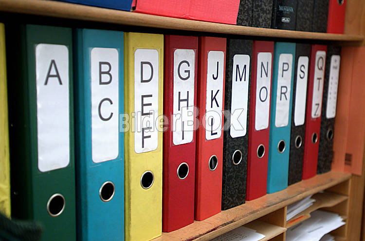 Beschreibung Aktenordner mit alphabetischen Buchstaben in einem Buero Copyright (2002) by BilderBox.com; Erwin Wodicka, A-4062 Breitbrunn. Tel.: 0043 676 5103 678. Veroeffentlichung nur nach unseren AGBs:...