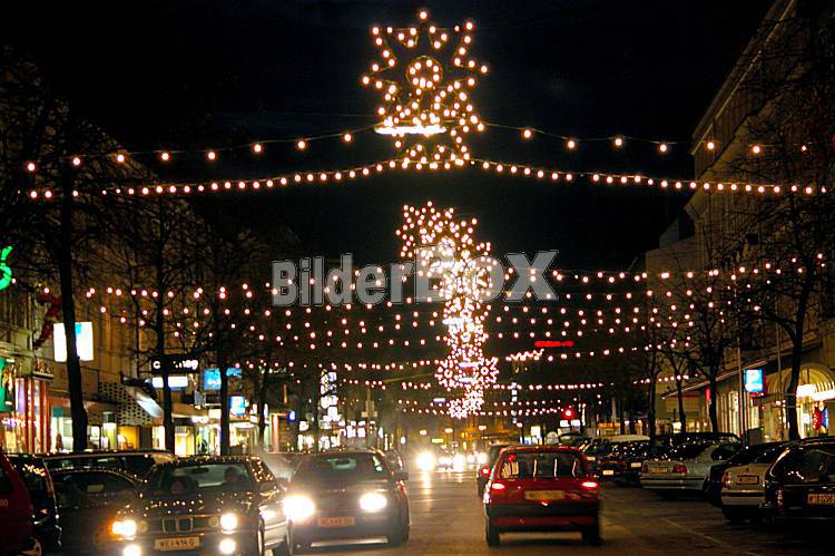 Weihnachtsbeleuchtung auf einer Einkaufsstrasse; Thening, AUT, 24.12.2002; Weihnachten, Religion, Weihnachtsbeleuchtungen, Einkaufsstrassen, Lichterketten, Weihnachtsgeschäft, Weihnachtsgeschaeft,... |