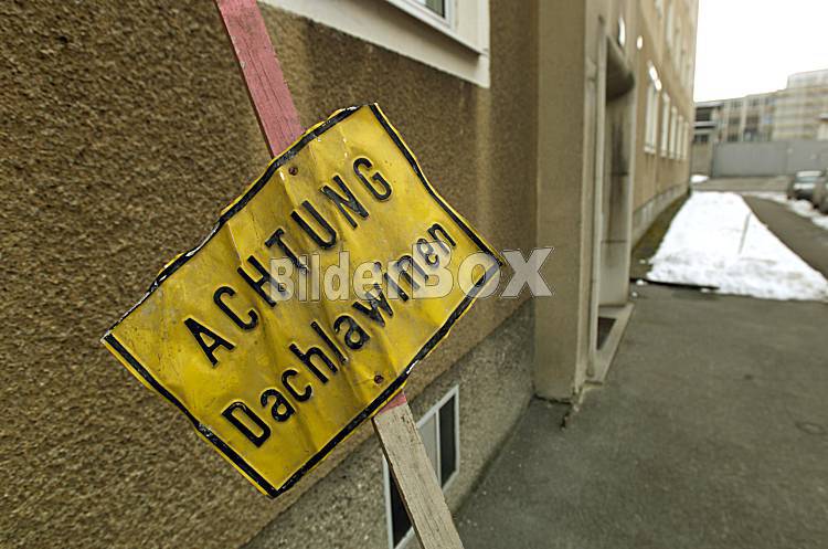 Beschreibung Warntafel fuer Dachlawinen - 15.02.2003, [ (c) BILDERBOX.COM / ERWIN WODICKA; Tel: +43 676 5103 678; Verwendung nur gegen HONORAR, URHEBERVERMERK, BELEG und unseren AGBs ( www.bilderbox.com)...