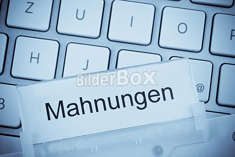 Beschreibung Eine Mappe für Akten im Hängeregister vor einer Computertastatur zum Thema: Mahnungen