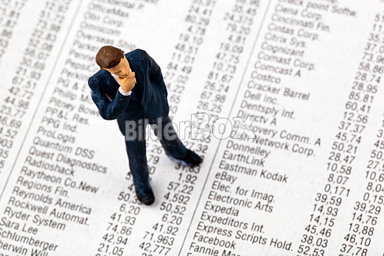 Beschreibung Eine kleine Figur und die Kurse von Aktien in einer Zeitung. Geld verdienen an der Börse. Gewinne und Verluste im Aktienhandel.