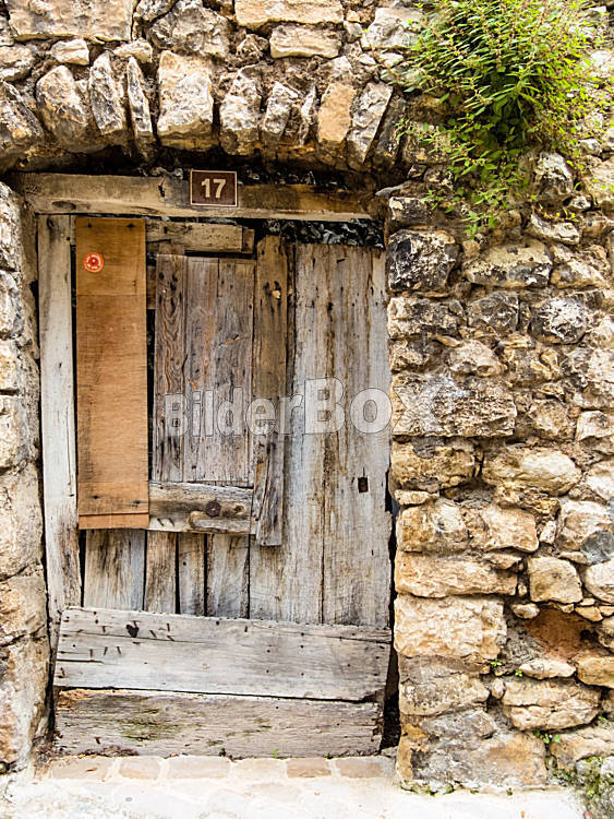 Beschreibung Alte Haustür aus Holz in einem alten Steinhaus