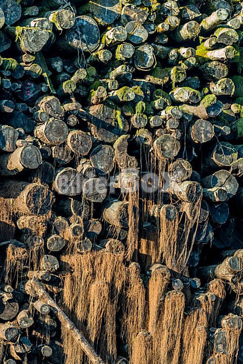 Beschreibung Alter Stapel mit Moos und Feuerholz, Symbol für Baumaterial, Brennstoff, Vergänglichkeit, Tod