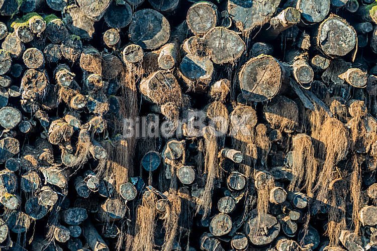 Beschreibung Alter Stapel mit Moos und Feuerholz, Symbol für Baumaterial, Brennstoff, Vergänglichkeit, Tod