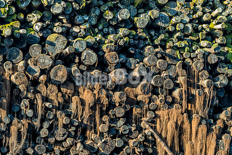 Beschreibung Alter Stapel mit Moos und Feuerholz, Symbol für Baumaterial, Brennstoff, Vergänglichkeit, Tod