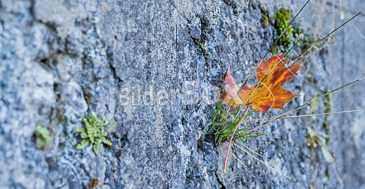 Beschreibung Altes fallendes Herbstblatt wurde von jüngeren Trieben aufgefangen. Symbol für Zusammenhalt und miteinander.