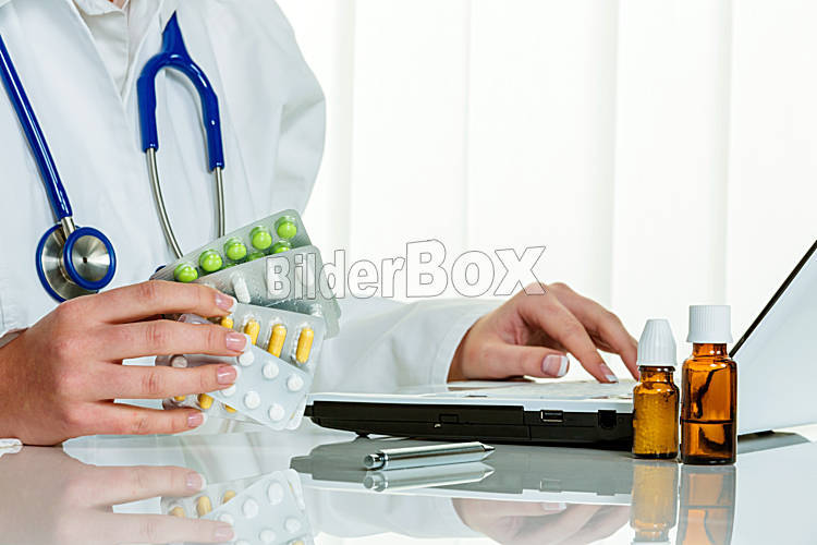 Beschreibung Ein Arzt stellt ein Rezept für Medikamente aus. Rezeptpflichtige Tabletten aus der Apotheke.