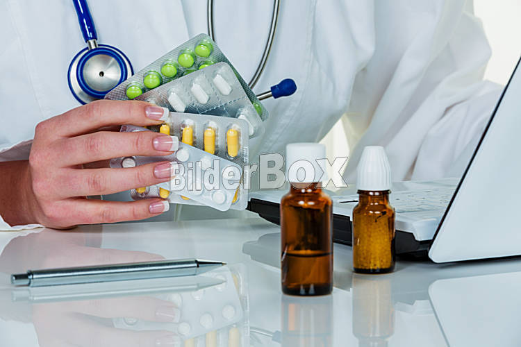 Beschreibung Ein Arzt stellt ein Rezept für Medikamente aus. Rezeptpflichtige Tabletten aus der Apotheke.