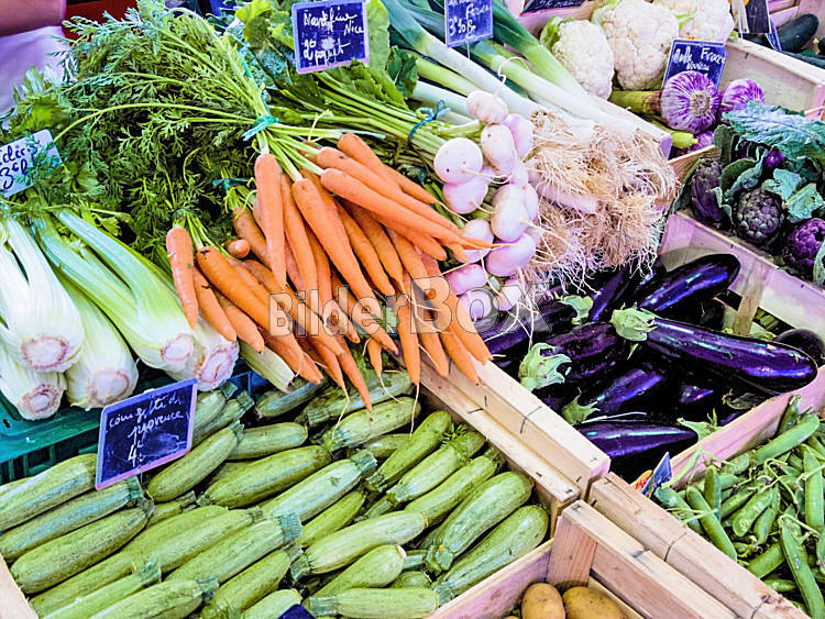 Beschreibung Auswahl an Gemüse auf dem Markt, Symbolfoto für Lebensmittel, Gesunde Ernährung, Einzelhandel