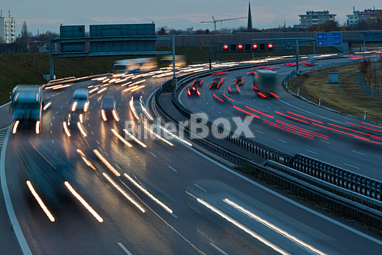 Beschreibung Viele Autos fahren bei Nacht auf einer Autobahn und erzeugen Lichtspuren.