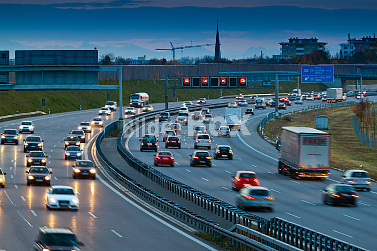 Beschreibung Autos im Verkehr auf einer Autobahn am Abend