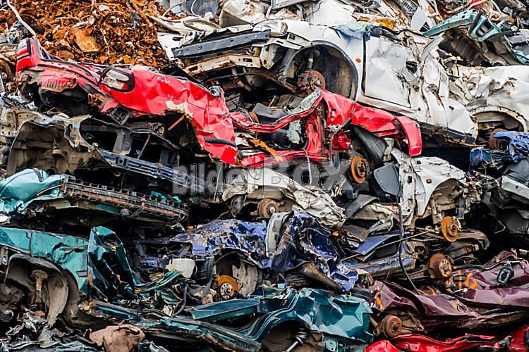 Beschreibung Alte Autos wurden in einer Schrottpresse verschrottet. Alteisen und Verschrottungsprämie für Autowracks