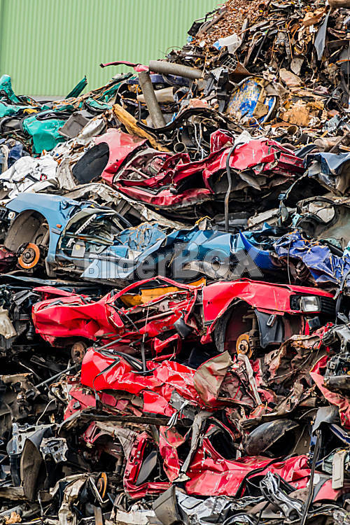 Beschreibung Alte Autos wurden in einer Schrottpresse verschrottet. Alteisen und Verschrottungsprämie für Autowracks