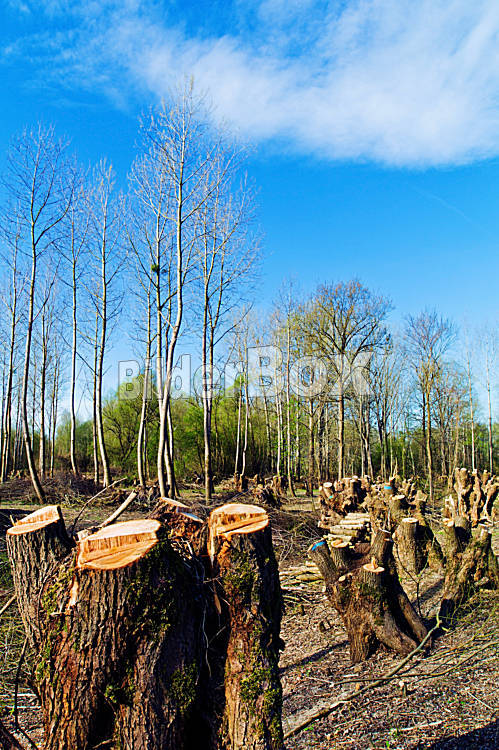 Beschreibung Viele Bäume in einem Wald wurden umgeschnitten. Pflege des Waldes