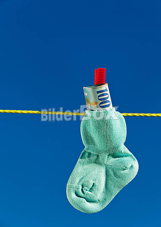 Baby Socken auf Wäscheleine mit Schweizer Franken