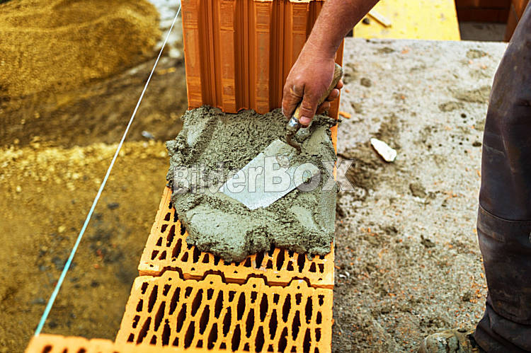 Beschreibung Anonymer Bauarbeiter auf einer Baustelle beim Hausbau errichtet eine Wand aus Ziegel. Ziegelmauer eines Massivhauses. Symbolbild für Schwarzarbeit und Pfusch