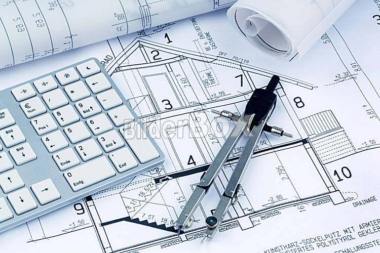 Beschreibung Ein Bauplan eines Architekten für den Bau eines neuen Wohnhauses. Symbolfoto für Finanzierung und Planung eines neuen Hauses.