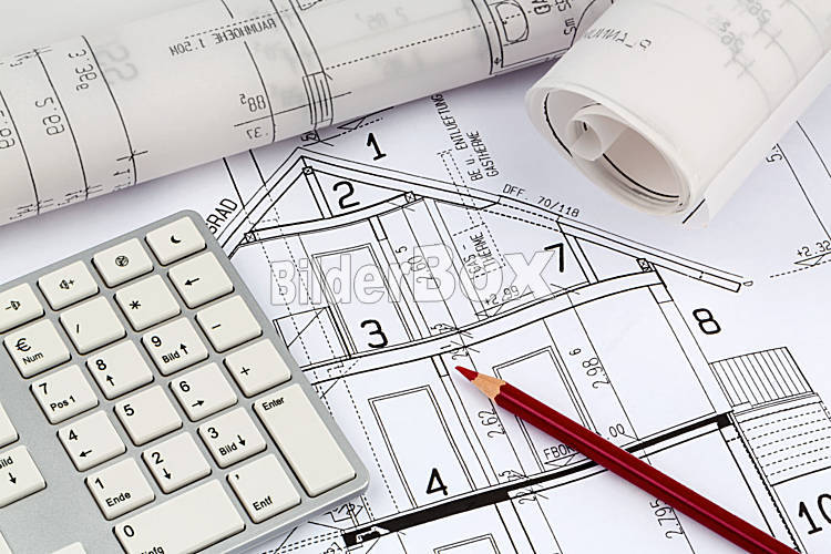Beschreibung Ein Bauplan eines Architekten für den Bau eines neuen Wohnhauses. Symbolfoto für Finanzierung und Planung eines neuen Hauses.