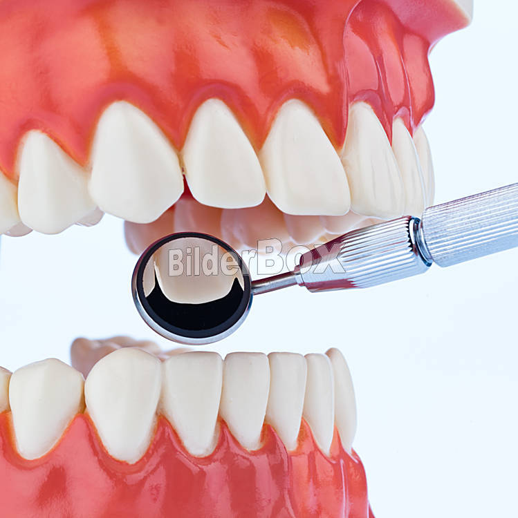 Beschreibung Das Modell eines Gebisses mit Zahnarzt Geräten. Isoliert auf weißem Hintergrund.