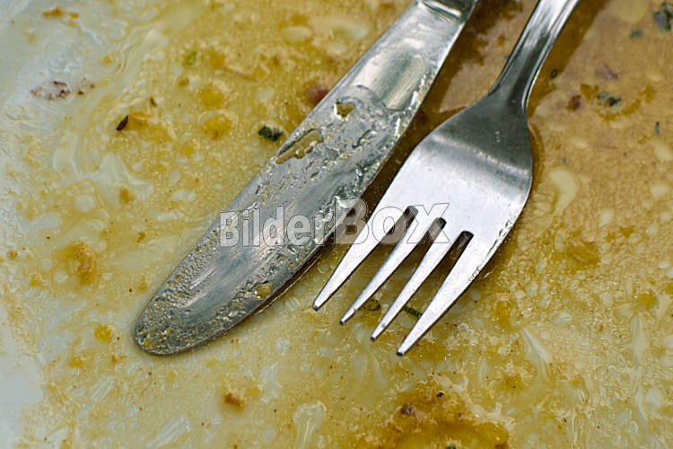 Beschreibung Ein Besteck liegt nach dem Essen auf einem Teller