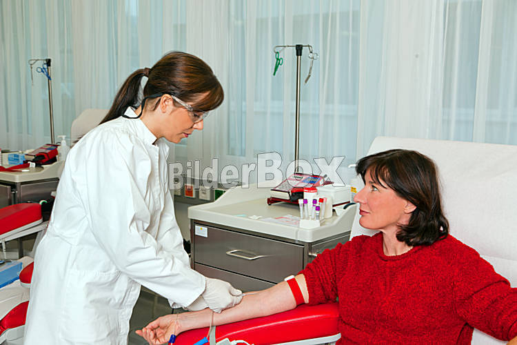 Beschreibung Krankenschwester und Patienten bei Blutabnahme. Blutspenden in Blutlabor.