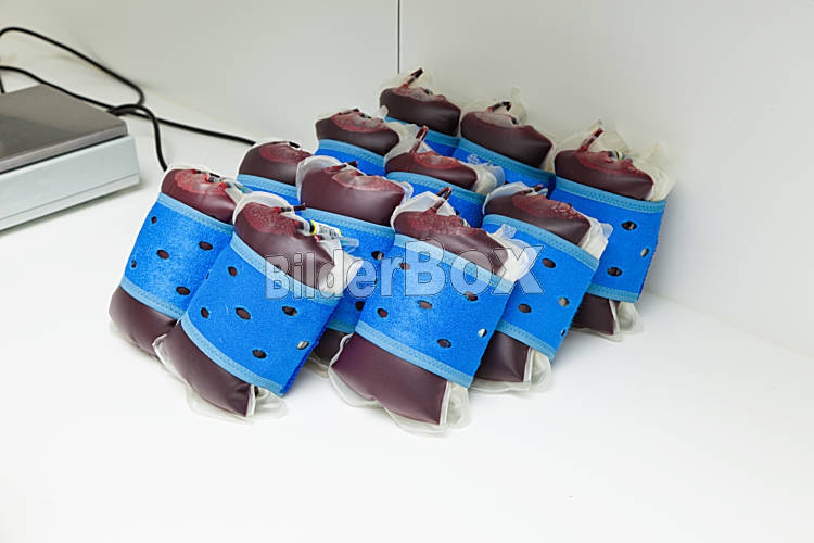 Beschreibung Blutbeutel mit Spenderblut im Blutlabor. Blut als Blutkonserve.