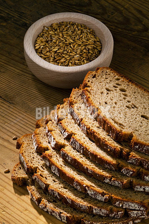 Beschreibung Mehrere Schnitten aus dunklem Brot liegen nebeneinander. Gesunde Ernährung.