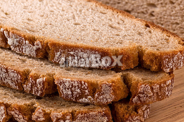 Beschreibung Mehrere Schnitten aus dunklem Brot liegen nebeneinander. Gesunde Ernährung.