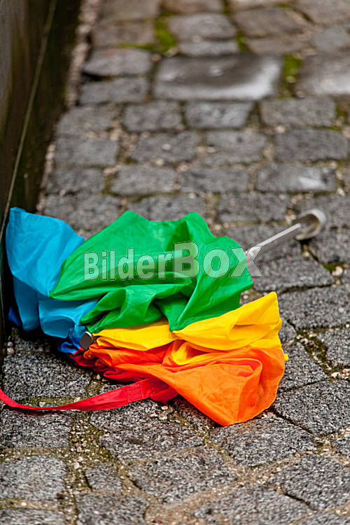 Beschreibung Bunter Regenschirm an einem Tag mit starkem Regen