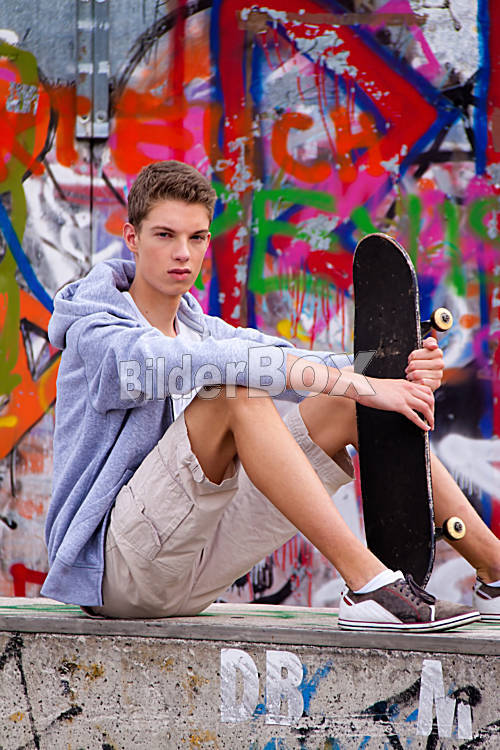 Beschreibung Ein cool blickender Jugendlicher Mann vor Graffiti