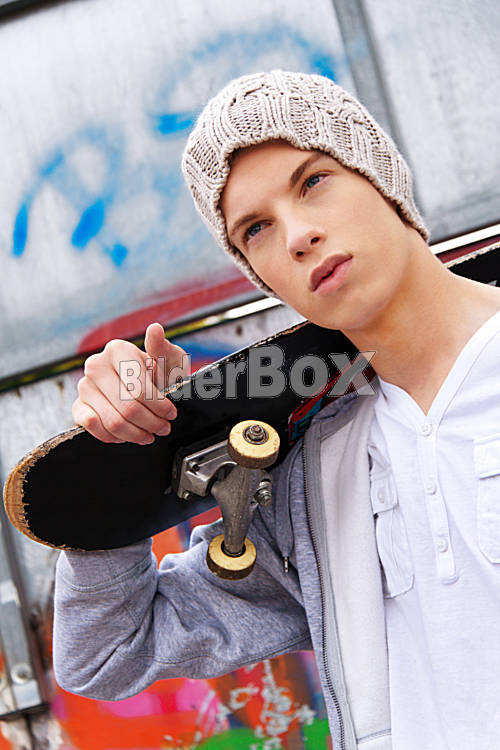 Beschreibung Ein cool blickender Jugendlicher Mann vor Graffiti